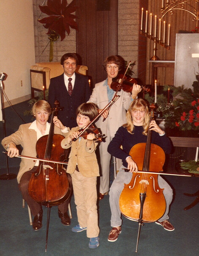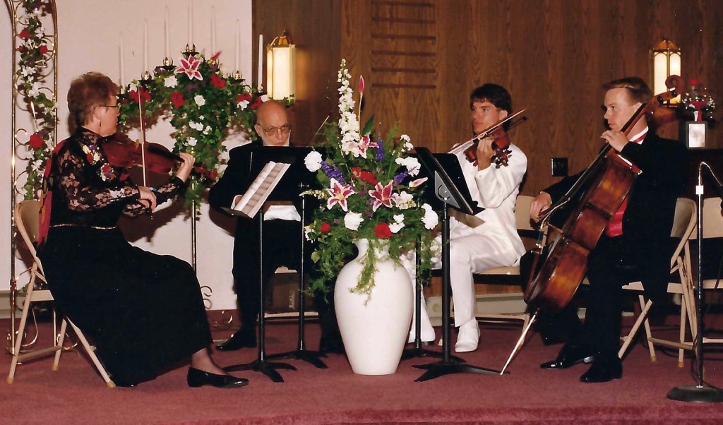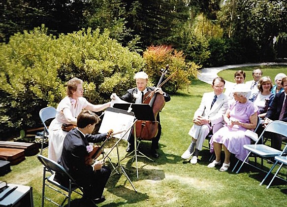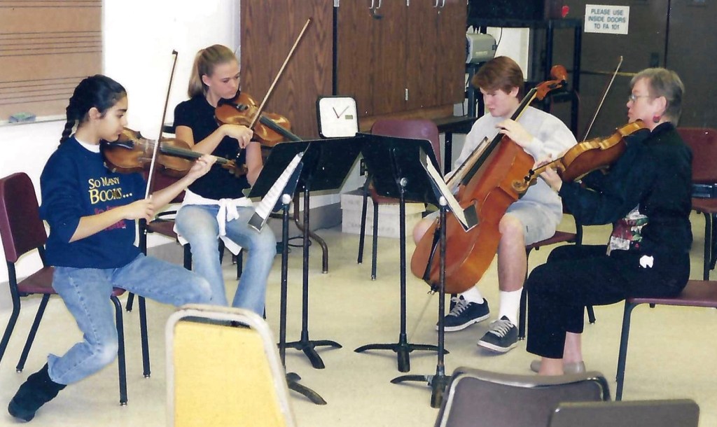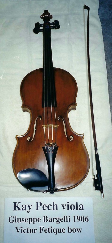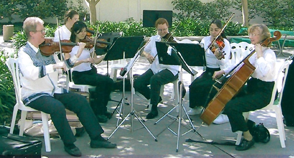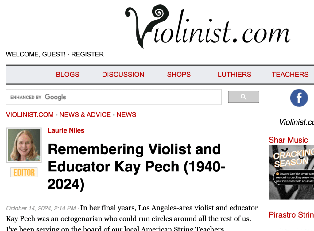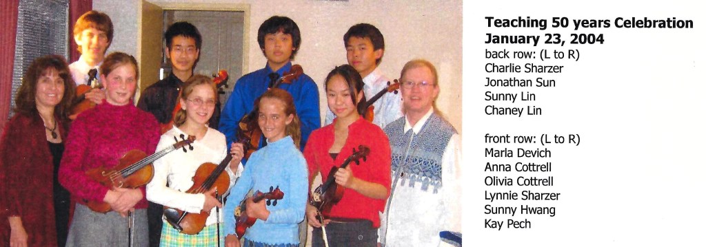 In 1977, Kay and her husband and two young sons (a cellist and a violinist) moved to Southern California where she once again rose quickly in the professional music scene. Soon she was performing with groups such as the Disneyland Christmas Candlelight Orchestra (43 years as the principal violist), Pacific Symphony (assistant principal violist), Downey Symphony (principal violist), and others; teaching at local colleges such as Saddleback College (21 years) and Cal Poly Pomona (8 years); and filling her home studio with violin and viola students. You won’t hear Kay Pech mentioned in the same sentence as some of the more famous teachers—like David Oistrakh or Eudice Shapiro—because she didn’t teach at the big-name schools, but the impact of her teaching was just as important. Famous teachers can focus on honing their students’ highly advanced skills because teachers like Kay have already laid down the fundamentals so well that no remediation is needed. It didn’t matter to Kay if her students went to Juilliard or simply continued playing as an avocation; she wanted them to play with excellence and with a love for the music, especially chamber music. Kay was a champion of the string quartet in all its forms, from baroque to modern.