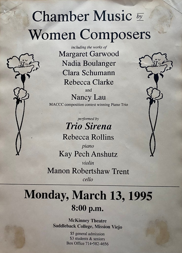 “I first met Kay when I moved to SoCal as a young newlywed from New England 35 years ago. I had been playing violin since elementary school but after college I had gravitated towards the viola. I didn’t really follow up on things until I got out here and enrolled in Kay’s chamber music class at Saddleback College. It was Kay who encouraged me to pursue the viola and to this day, I have all the bowings and fingerings she shared with me in many of my viola parts. She was a consistently effective and efficient coach – probably the best I have ever had. I learned so much from her! And now it is the viola which I play full time, two grown children and many years later. In addition to teaching our class, Kay organized and presented weekend programs and chamber music marathons at the college. I feel lucky to have participated in them. I then had the pleasure of landing a spot in the Disneyland Christmas Candlelight Orchestra and Kay warmly welcomed me into the section. We shared some good times together there and she always took great pictures of the celebrity guest and our section.” —Leonie Kramer, violist