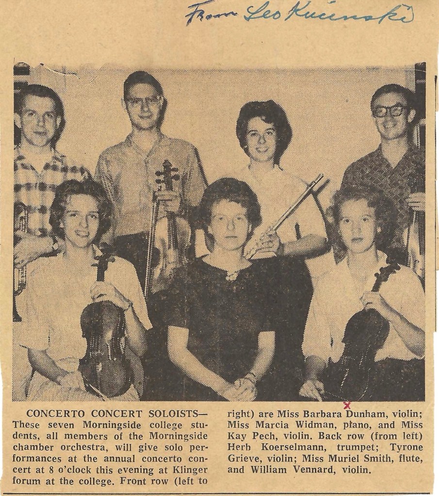 Kay also had other options. She was talented enough at golf to be approached by an LPGA pro asking her to consider choosing that as a career, but music called to her soul. During her years as a music student at Morningside (where she earned a bachelor of music education in violin performance), Kay played violin in the Sioux City Symphony Orchestra, also conducted by Leo Kucinski, where Leo continued to influence her musical imagination.