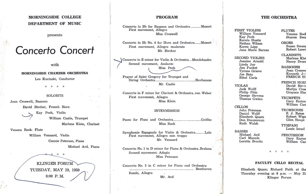 Kay Pech (born Joyce Kay Pech; pronounced “pesh”) was always a barrier-breaker, never afraid to question authority and blaze her own trail. Growing up in Iowa in the 1940s, no one in her family played a musical instrument, but she demanded to begin violin lessons at age four. As a teenager she began teaching violin to young children and eventually became the first person in her family to attend college. Her parents, not understanding why a woman would want to go to college, provided no financial help. No one guided her to try out for one of the big music schools, so she went to the local college, Morningside College (now Morningside University), where she was fortunate enough to sit under the gifted and inspirational baton of Leo Kucinski. Even so, a young woman in Iowa in the late 1950s was expected to get married, stay at home, and have children. The only possible reason to get a music degree was to become a music teacher; the idea of a woman becoming a professional violinist was almost unthinkable. Yet Leo encouraged Kay to do just that.